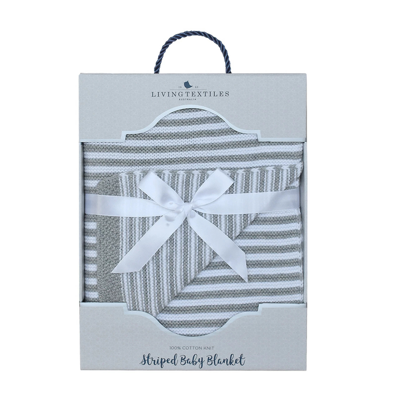 Versatile and light weight, this gorgeous 100% cotton pearl knit blanket features a classic contrasting grey and white stripe. Perfectly sized for the bassinet or pram with a hint of stretch to avoid bunching the mattress, this blanket is an essential for every baby.