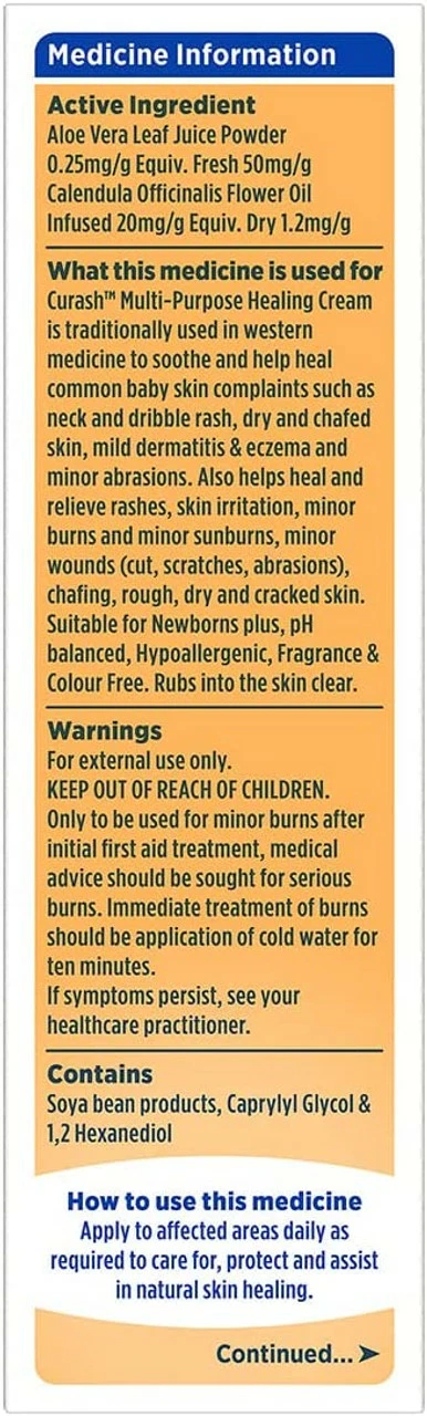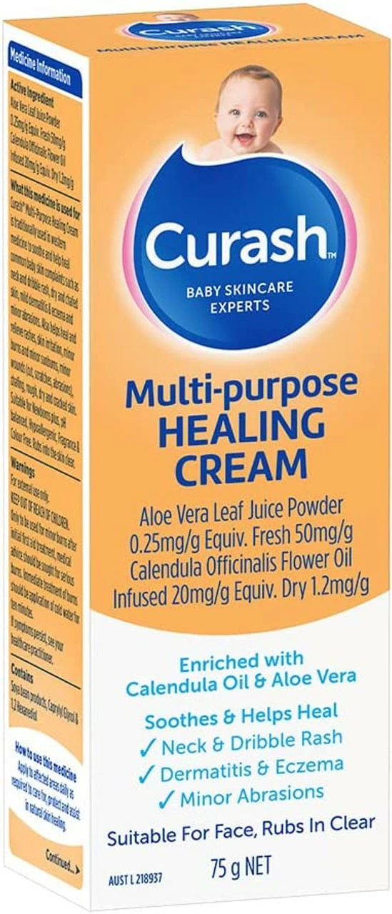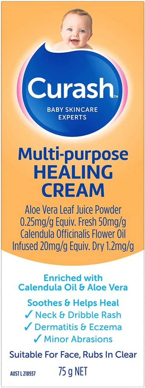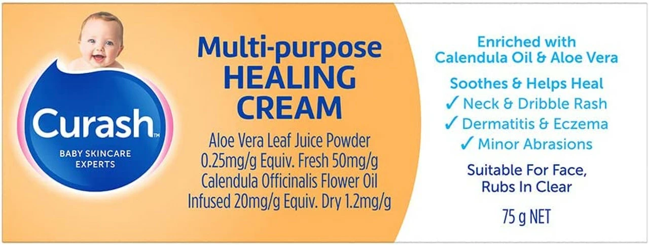 Enriched with Calendula Oil and Aloe Vera, Curash Babycare Multi- Purpose Healing Cream soothes and helps heal common baby skin complaints such as neck and dribble rash, dry and chafed skin, dermatitis & eczema and minor abrasions. Curash Babycare Multi-Purpose Healing Cream has been specially formulated to be gentle of your babys delicate skin. It soothes and helps heal common baby skin complaints such as neck and dribble rash, dry and chafed skin, dermatitis & eczema and minor abrasions. Also helps heal and relieve rashes, skin irritation, minor burns and minor sunburns, minor wounds (cut, scratches, abrasions), chafing, rough, dry and cracked skin. Rubs into the skin clear. Always read the label and follow the directions for use. Baby Skin Experts Suitable For: Suitable for face.