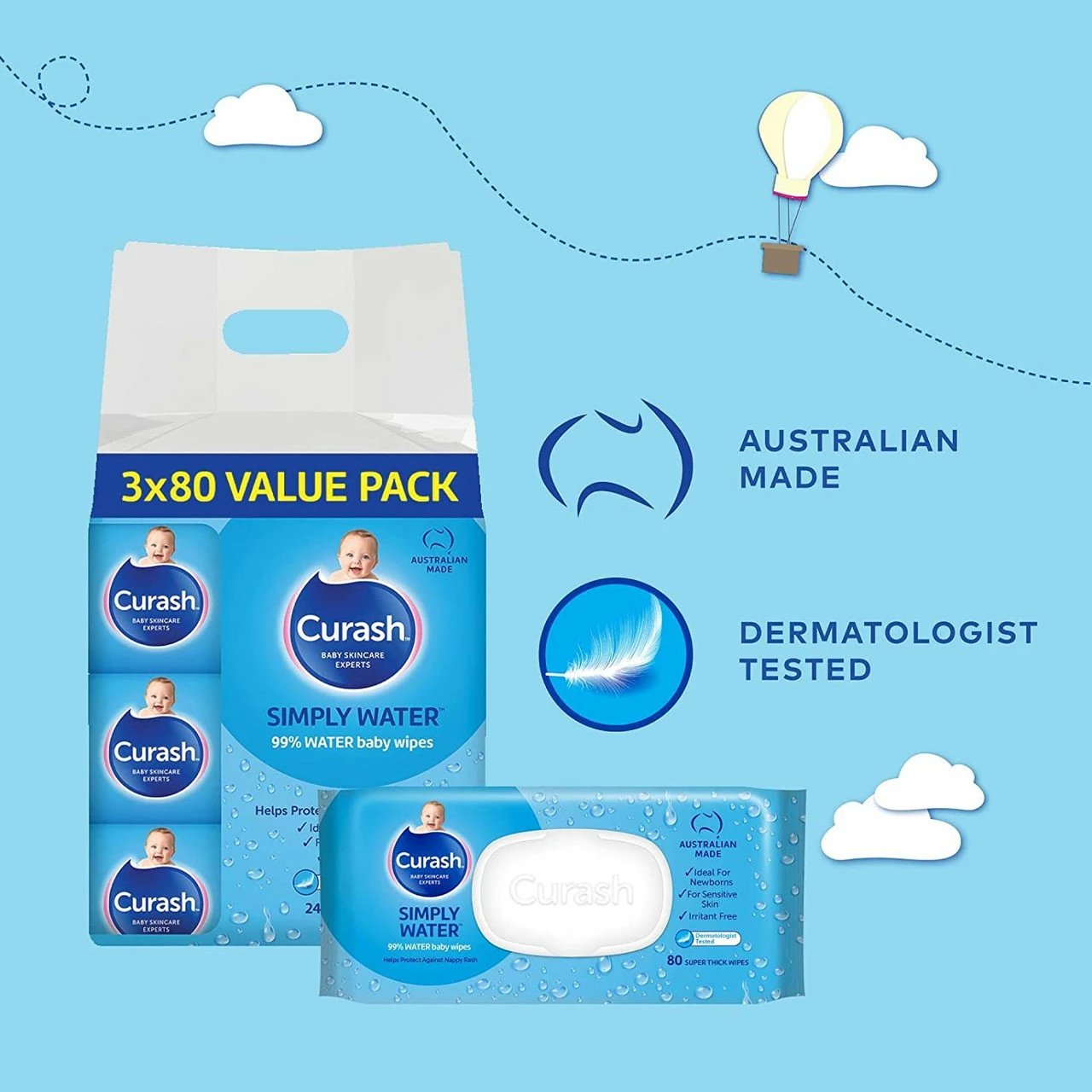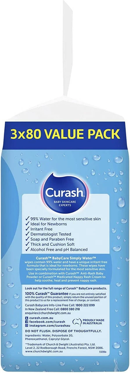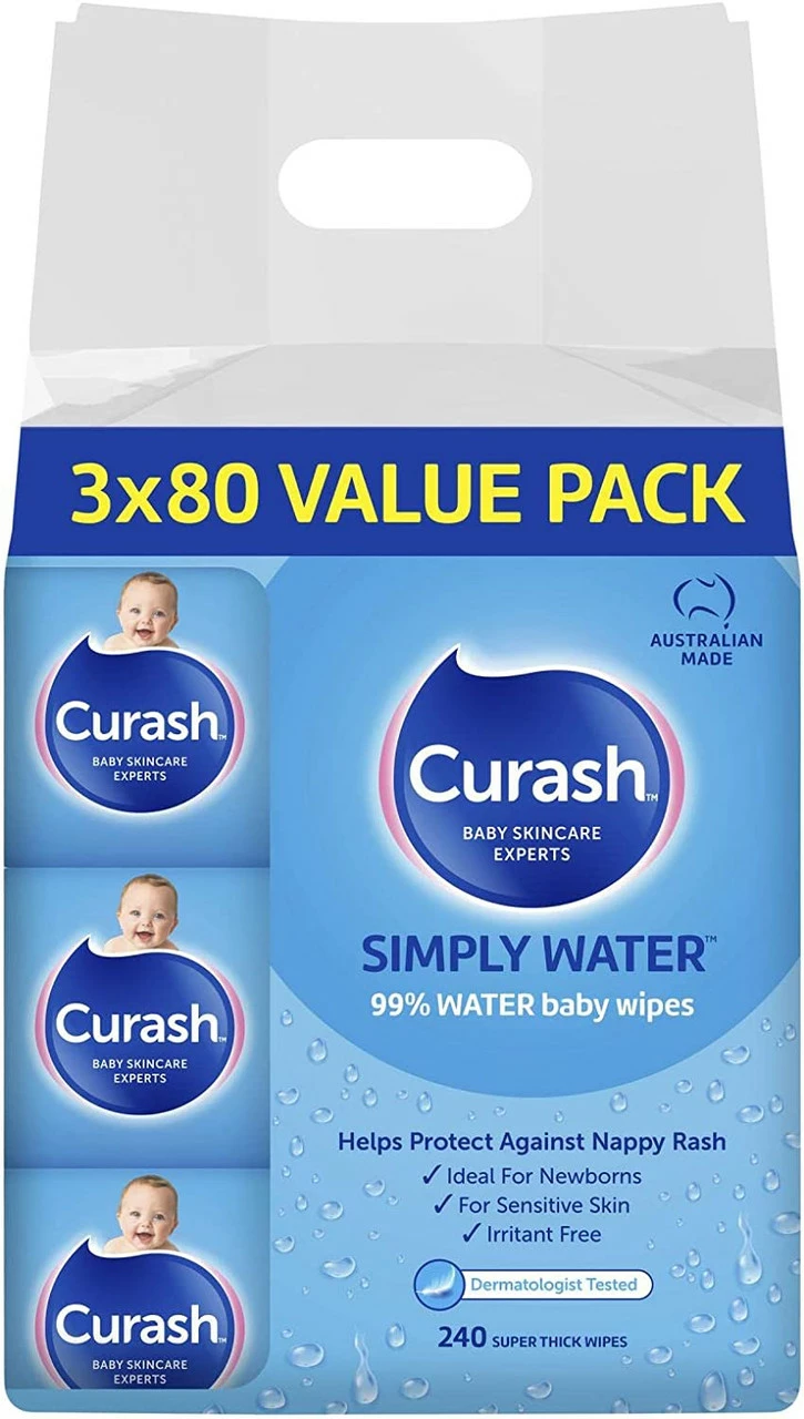 Curash Babycare Simply Water Wipes 3 x 80 Suitable For: Sensitive skin Product Claims: Irritant free. Soap and Paraben free, Alcohol free and pH balanced.