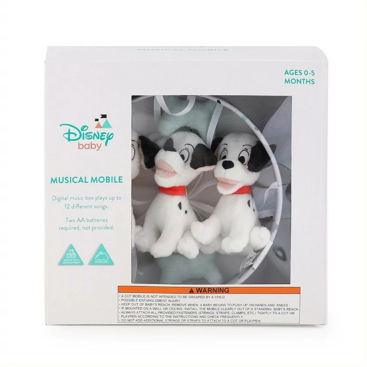 An adventure is bound to happen and your little one will be captivated dreaming of it under this Disney Dalmatians Musical Mobile. Three playful pups in signature black and white, and two bones in aqua are fashioned out of velour and suspended from a central ring covered in a playful tossed bone and dot print. Mobile pairs wonderfully with the Disney Dalmatians 4Pc Bedding Set and is the perfect thing to send your little one off to dreamland. Digital music box plays up to 12 lullabies. AA batteries required. Pair with other items from the Disney Dalmatians collection for the best of times with these popular pooches and your little one’s new best friends.