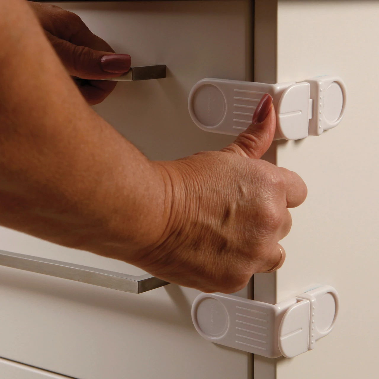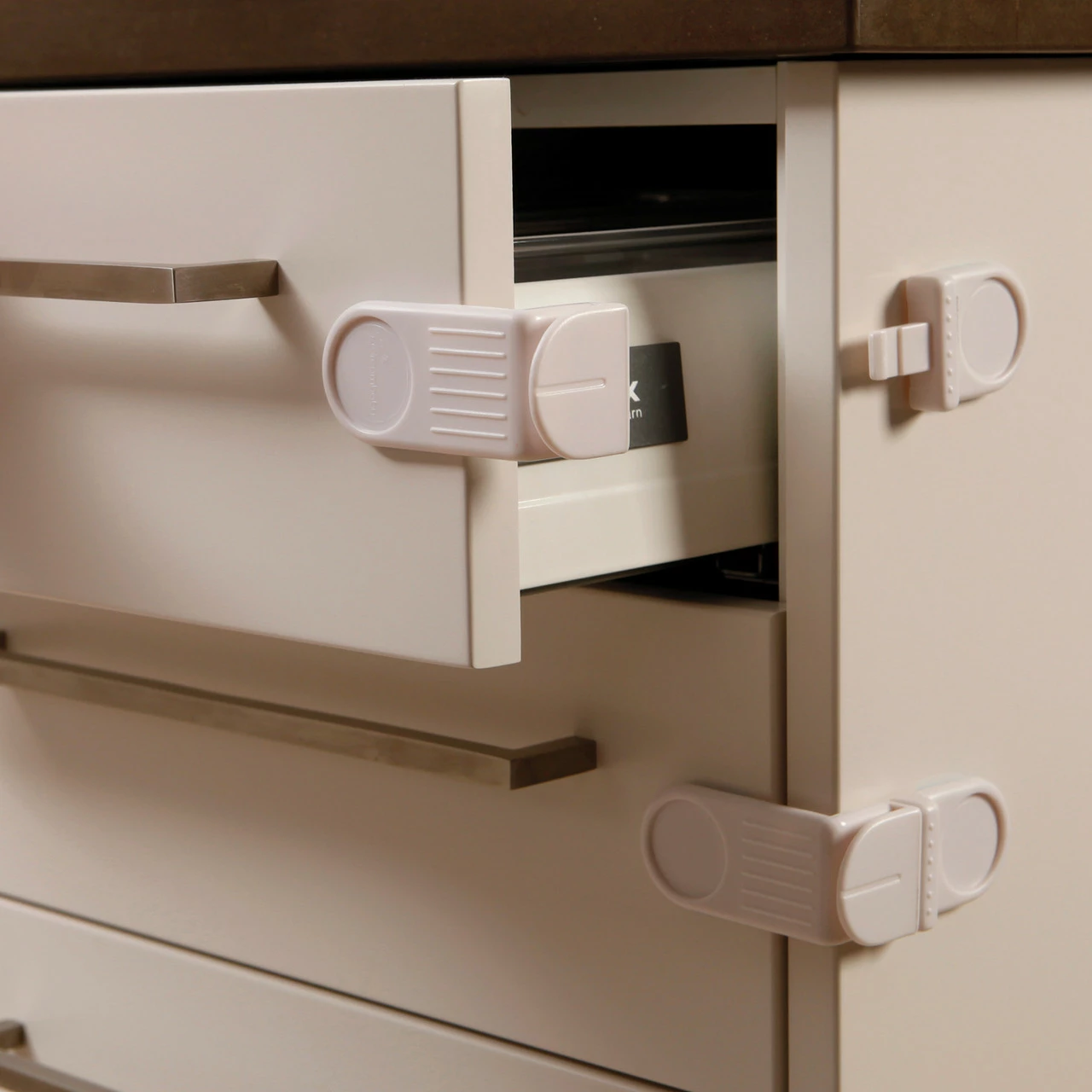 The Dreambaby® Angle Locks helps prevent children from opening and accessing corner drawers and cabinets.