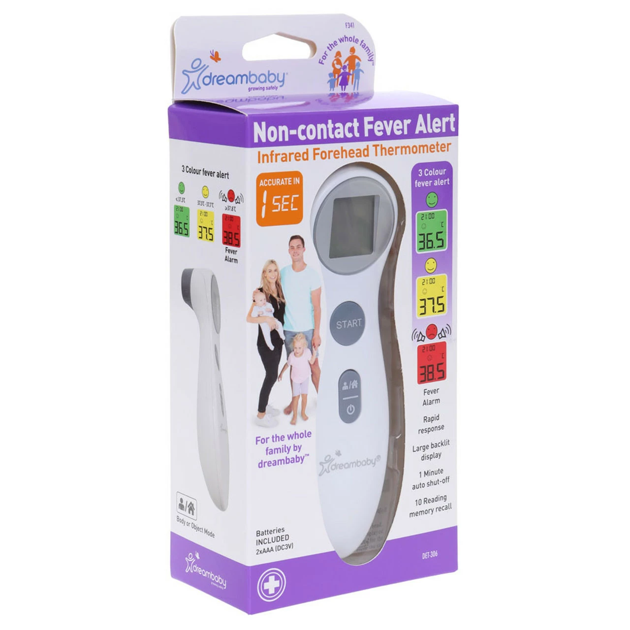 The Dreambaby® Non-Contact Fever Alert Infrared Forehead Thermometer provides fast, reliable readings and requires no skin contact at all. Simply hold the thermometer 2 to 3cm / 1in from the forehead to get a reading within moments.