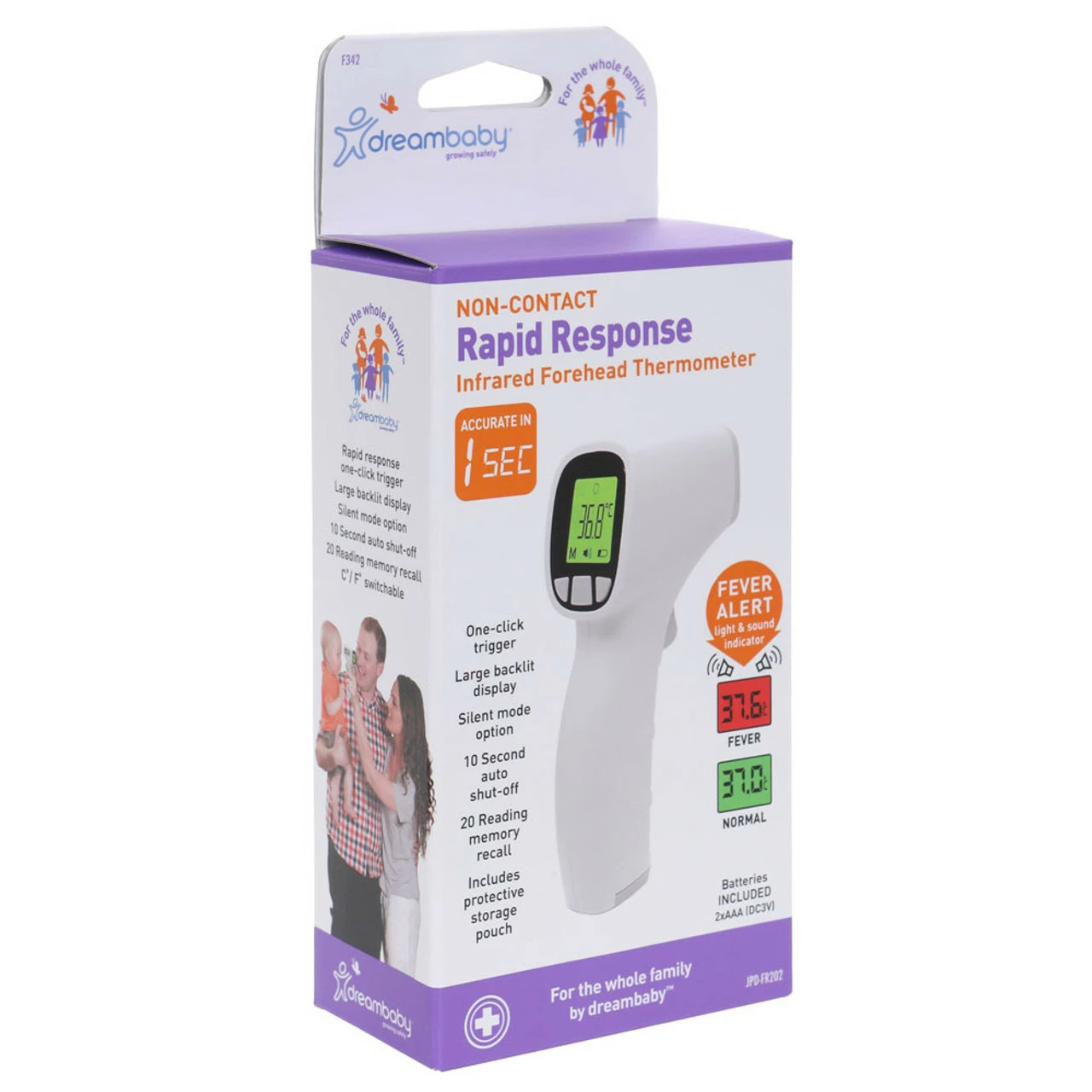 The Dreambaby® Non-Contact Rapid Response Infrared Forehead Thermometer provides fast, reliable readings and requires no skin contact at all. Simply hold the thermometer 2 to 3cm / 1in from the forehead to get a reading within moments.