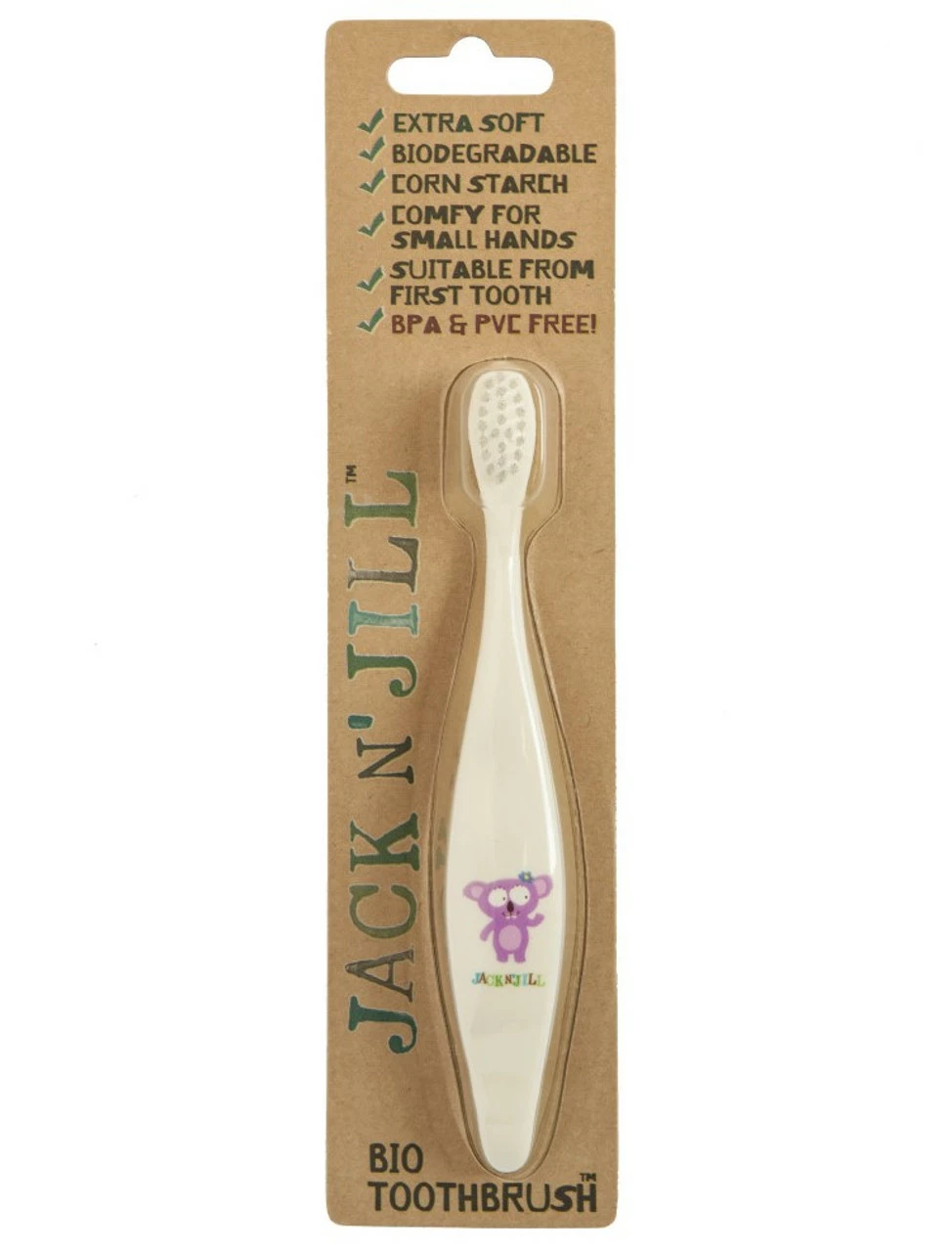 With a comfy handle designed specially for small hands and made from 100% corn starch (non GMO), this is a great first toothbrush. The soft nylon bristles are recyclable, BPA, PVC & Phthalate free