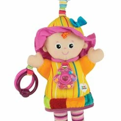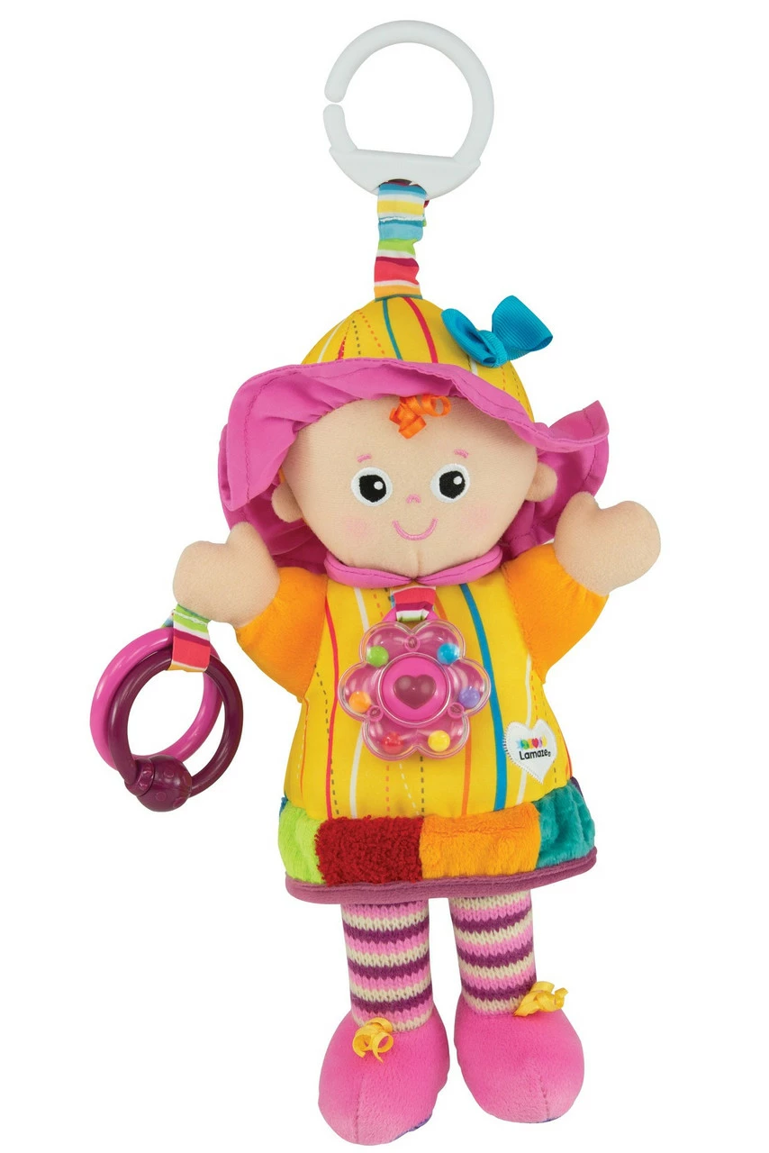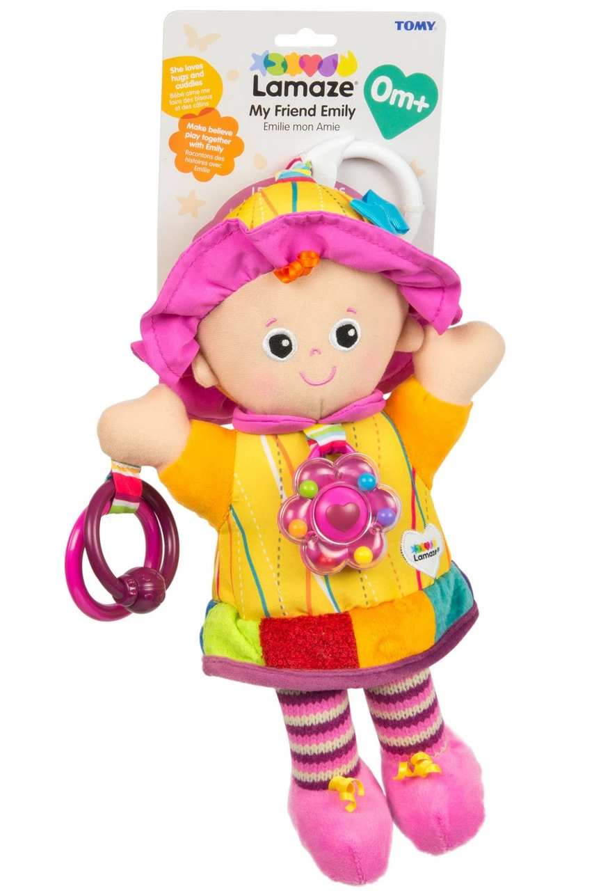 Emily is perfect for baby’s first doll! She comes complete with a rattle necklace, clinky rings and interesting textures and sounds. Emily helps baby through the vital first stages or development.Vision: bright contrasting colors and patterns stimulate baby. Sound: rattles, squeaks and crinkles helps hearing and listening senses. Touch: different textures to grip and grab to help improve motor skills. Emily is a wonderful introduction to loveable characters that aid inspiration, roll play and social skills. The Lamaze clip lets you hook Emily to strollers, carriers and diaper bags to take her along for on-the-go fun.