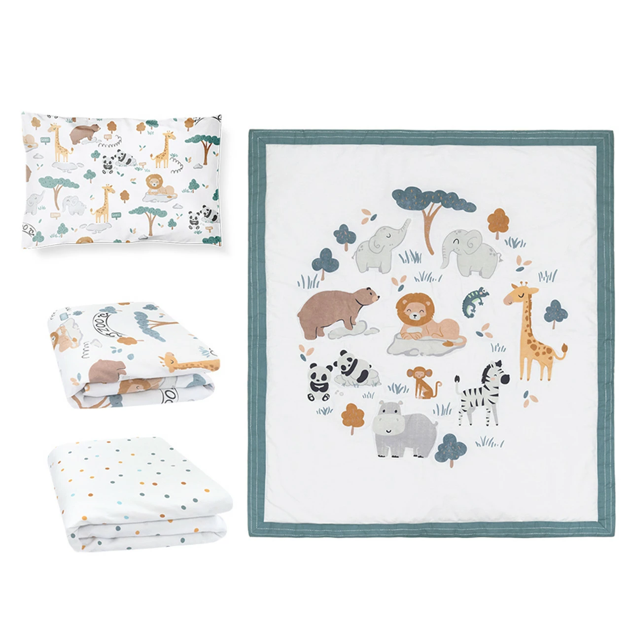 Quality and fun rolled into one! The Day at the Zoo 4-piece nursery set features four beautifully coordinated and complementary pieces including a cot quilt, two 100% cotton cot fitted sheets, and a reversible cot pillowcase. The gorgeous cot quilt features a fun zoo print with embroidery outline and a cotton sateen backing that lies smooth against your little one’s skin. Mix and match with one of two 100% cotton sateen cot fitted sheets in fun zoo or confetti dot prints, and when your toddler is ready, match with the reversible pillowcase. Coordinate with our other Day at the Zoo accessories including musical cot mobile, playmat, and fun removal wall decals to create your dream nursery. Features: Includes – cot quilt, 2 x fitted sheet and pillowcase Ultra-soft 100% cotton sateen softens with every wash Fitted cot sheets fit standard and large-sized cots Matching accessories and decor available Dimensions: Cot Quilt: 95 x 110cm Fitted Sheet: 77 x 132 x 19cm each Pillowcase: 61 x 42cm Materials: Cot Quilt: 100% cotton with 100% polyester fill Fitted Sheet: 100% cotton sateen Pillowcase: 100% cotton sateen