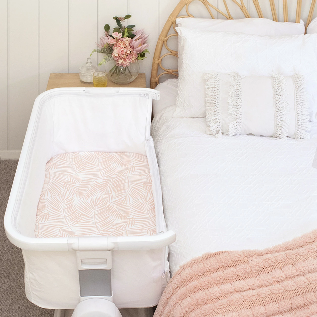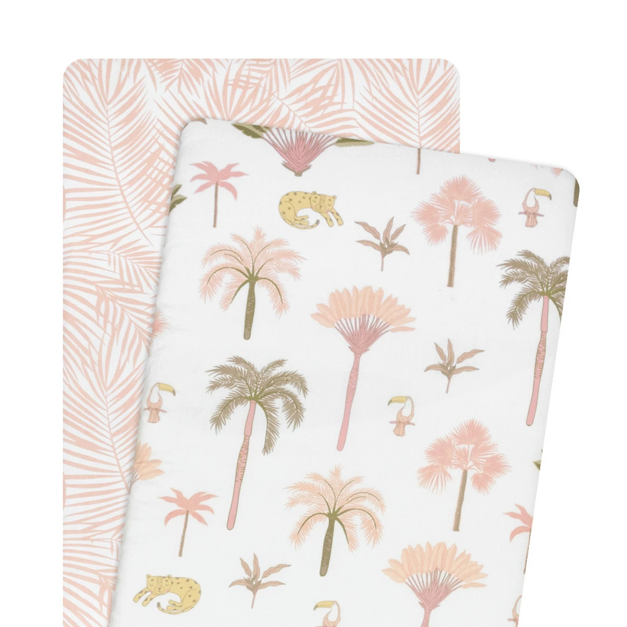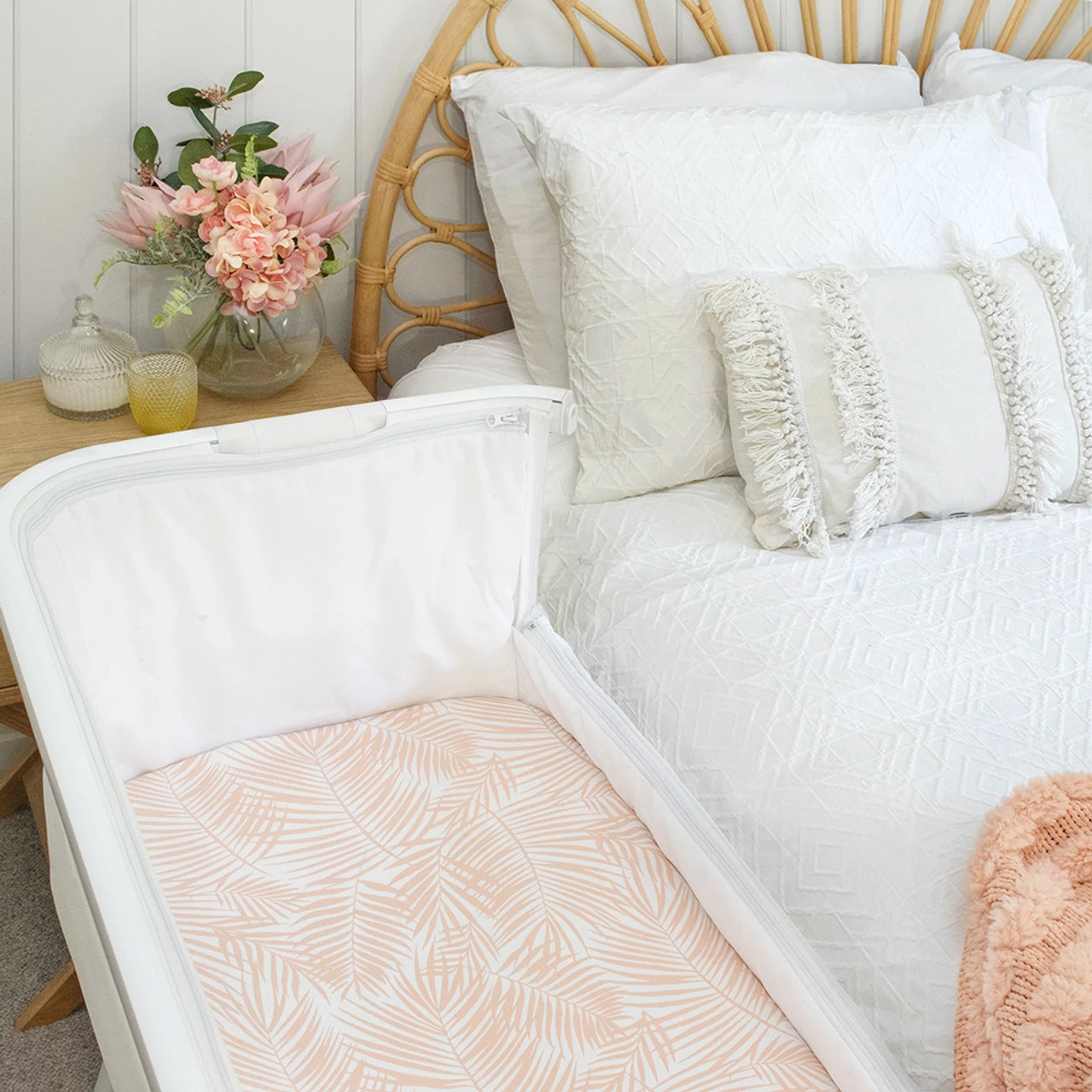 Add a layer of comfort and character to your baby’s bassinet with our delightfully soft and silky Tropical Mia Bedside Bassinet/Co-Sleeper fitted sheets. Made from 100% cotton sateen that feels soft and silky against baby’s skin, this sheet is fully elasticized and features extra-deep corners for the most secure fit possible. Match back with our coordinated Tropical Mia accessories including musical cot mobile, playmat and fun removal wall decals to create your dream tropical nursery. Features: Soft and silky 100% Cotton Sateen fabric Fully elasticised with extra deep sides for a secure fit Convenient 2 pack so you always have a spare Machine washable and tumble dry Sized at 90x50x12 cm to fit a range of bassinets, bedside bassinets and co-sleepers and more. Dimensions: 92 x 50 x 12cm Composition: 100% Cotton Sateen