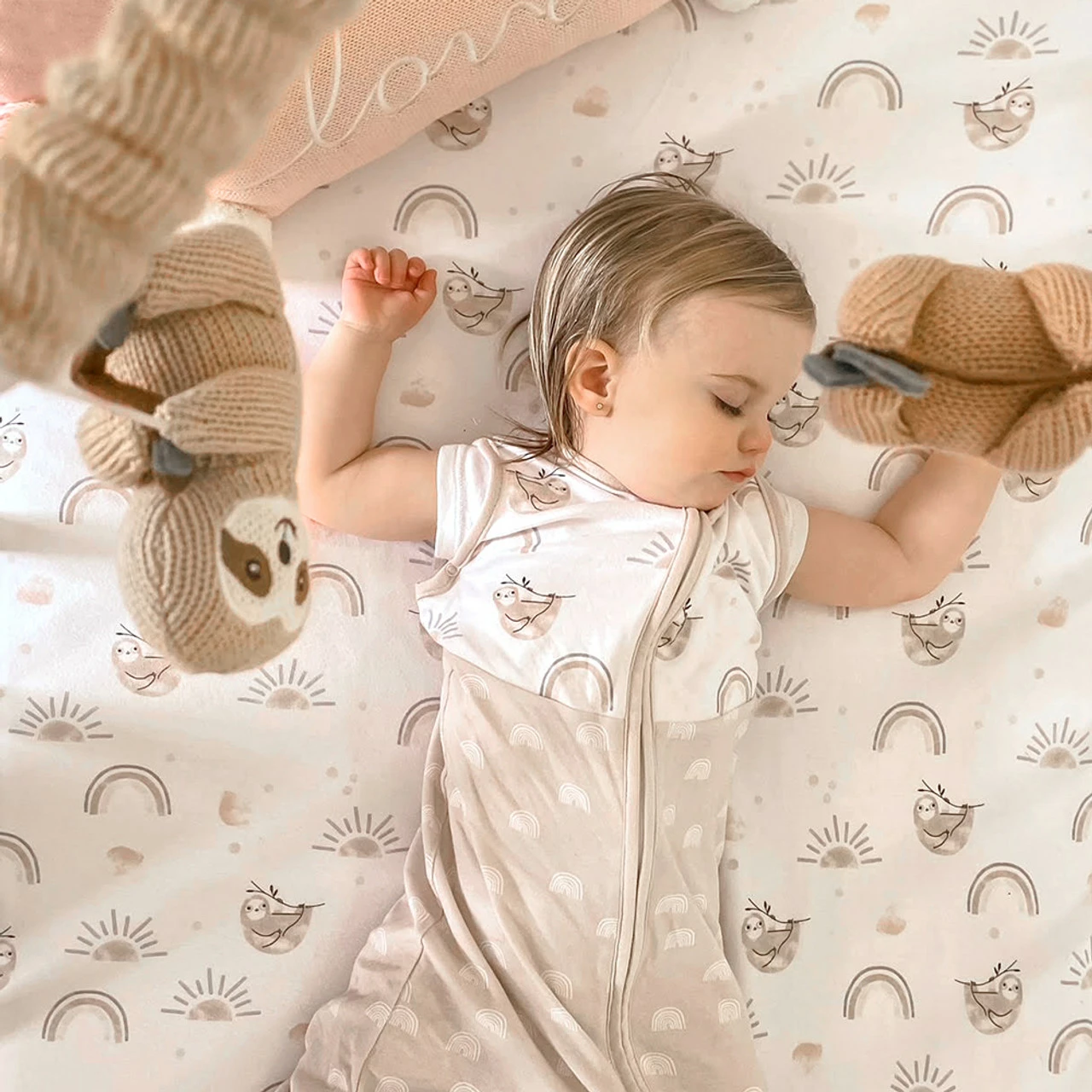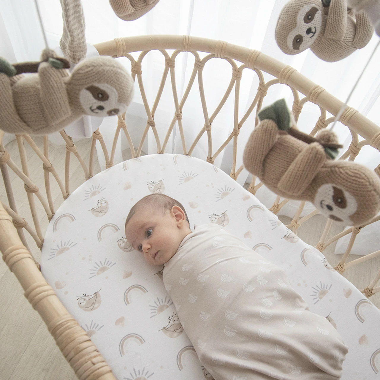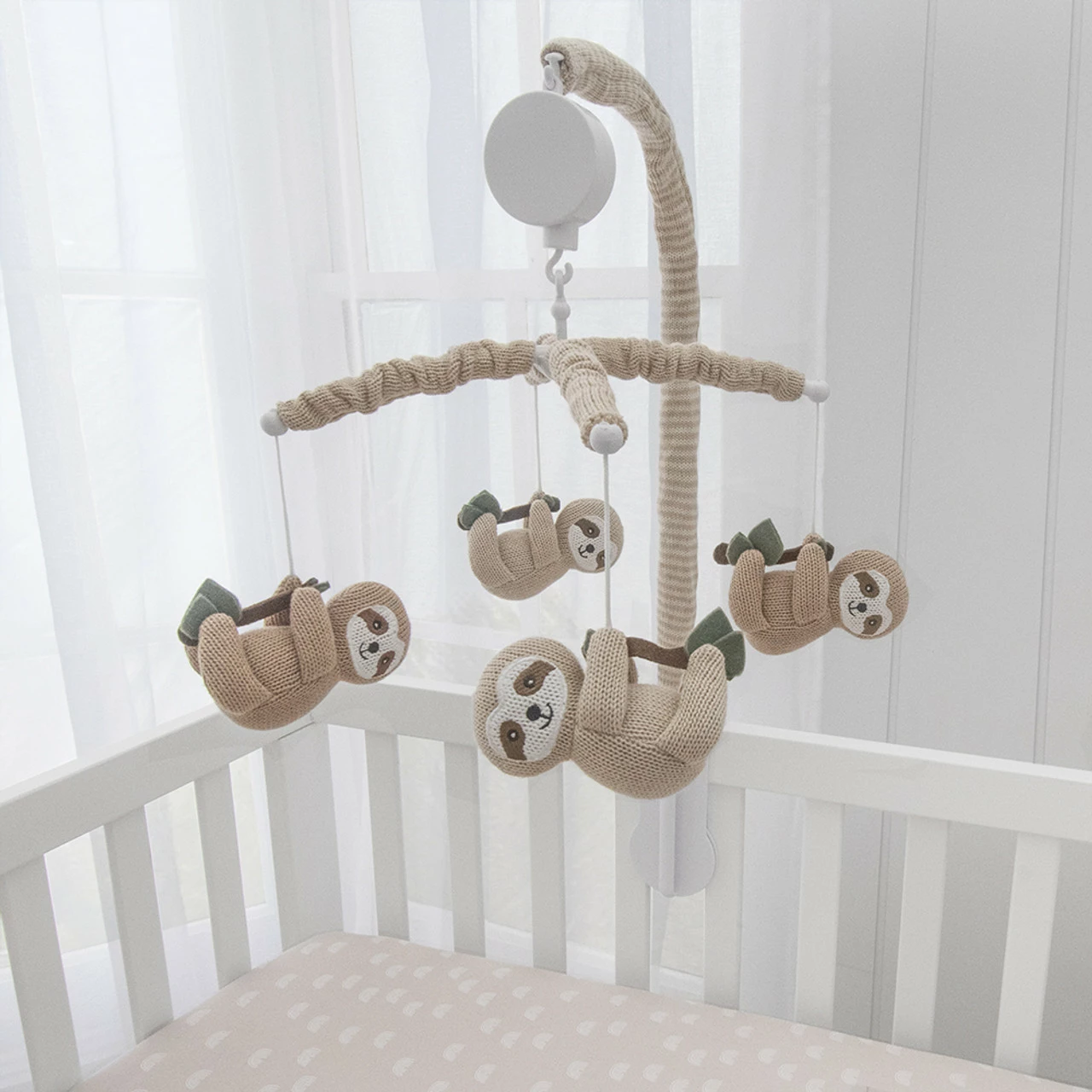 Little ones are going to love watching these sweet baby sloths hang out overhead to Brahms lullaby as they drift off to sleep. This gorgeous musical cot mobile features 100% cotton knit sloths with exquisite detailing and is the perfect finishing touch to your nursery.