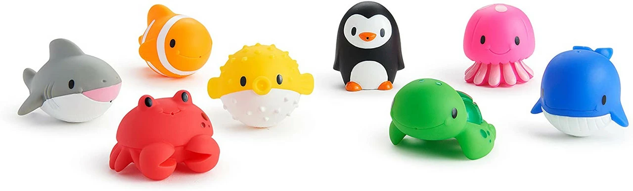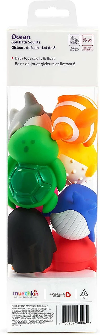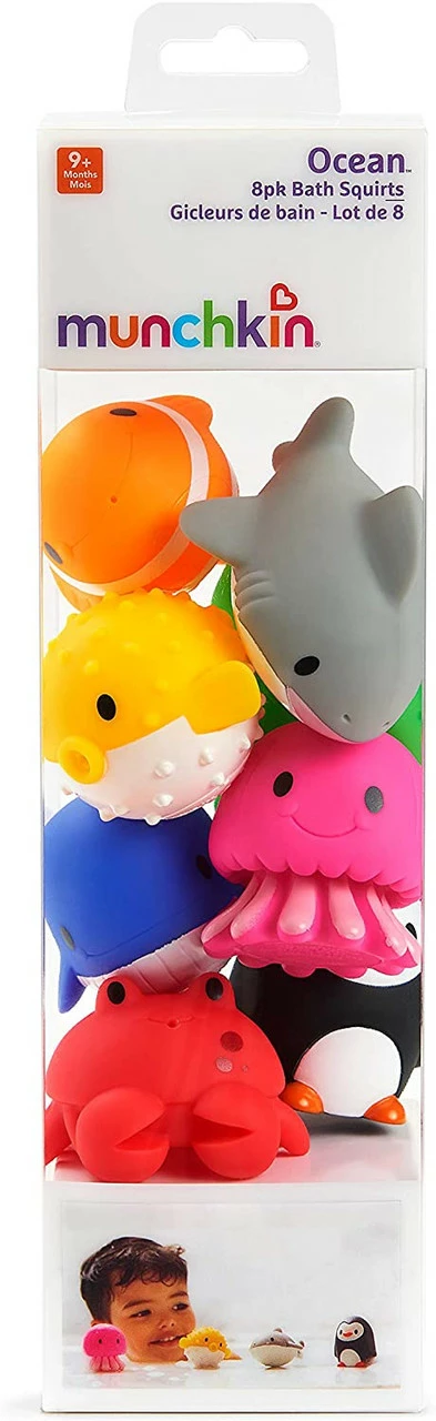 This set of eight colourful ocean squirts is guaranteed to keep bath boredom at bay! With the Ocean™ buddies, your little one can create stories of deep water fun while learning animal names like pufferfish, penguin, jellyfish, and more. Each brightly-coloured bath toy floats, squirts water, and is sized just right for little hands to grasp and squeeze. The clear canister provides easy storage and makes it a great baby or toddler gift, too! Introduce all eight toys at once for an exciting ocean adventure, or surprise your little diver with a new bath friend each day. Either way, bathtime is sure to go swimmingly!