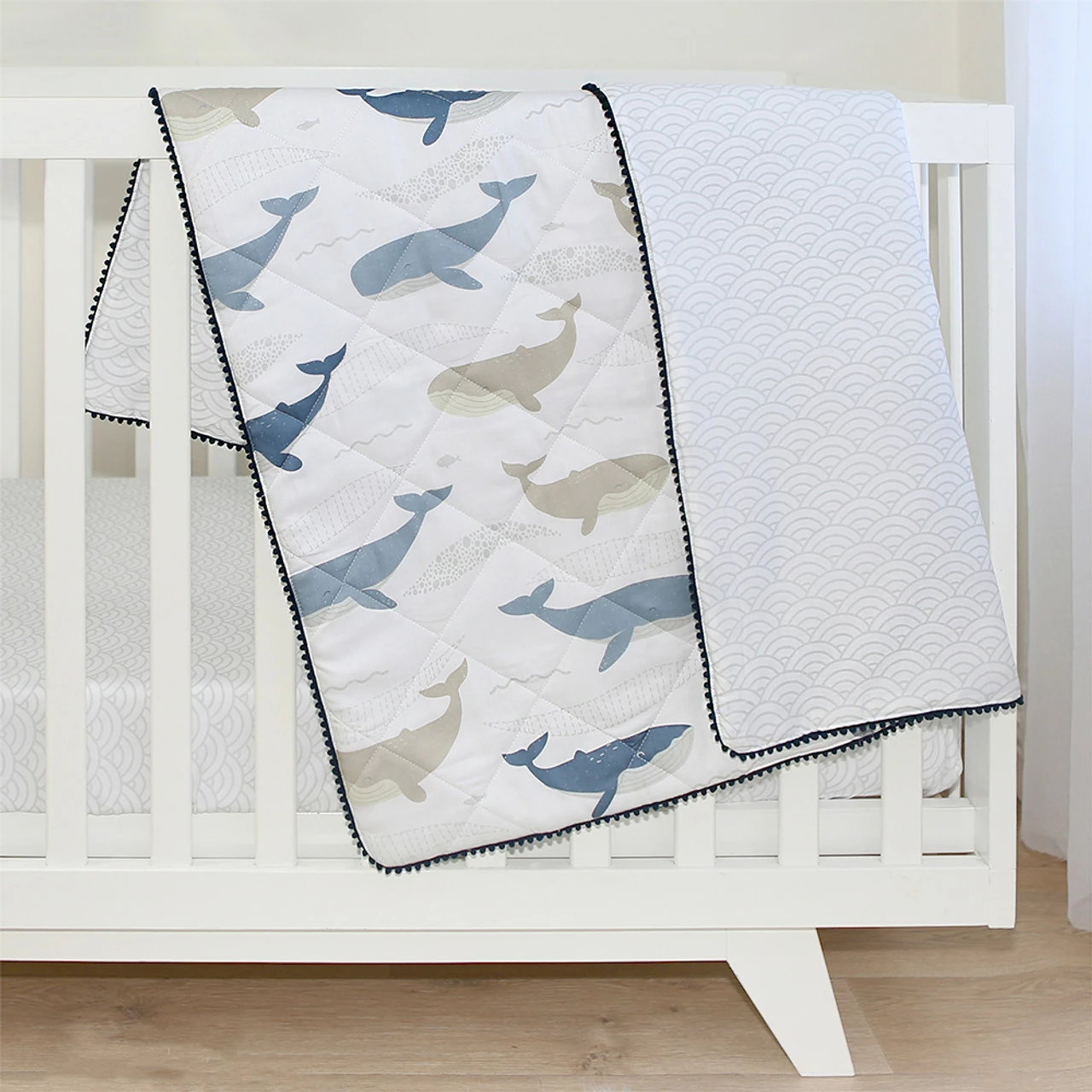 Lightly padded and diamond quilted, this reversible comforter features inspired fabrics that mix and match perfectly with the Oceania nursery collection.