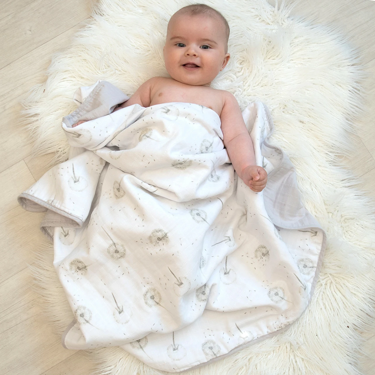 This luxurious organic baby blanket will ensure your little one always has the cosiest and cutest of outings. Crafted from 6 layers of soft and silky 100% organic cotton muslin and featuring a reversible design, this lightweight, breathable blanket is perfect all year round. Match back with other items in the Living Textiles Dandelion Collection.