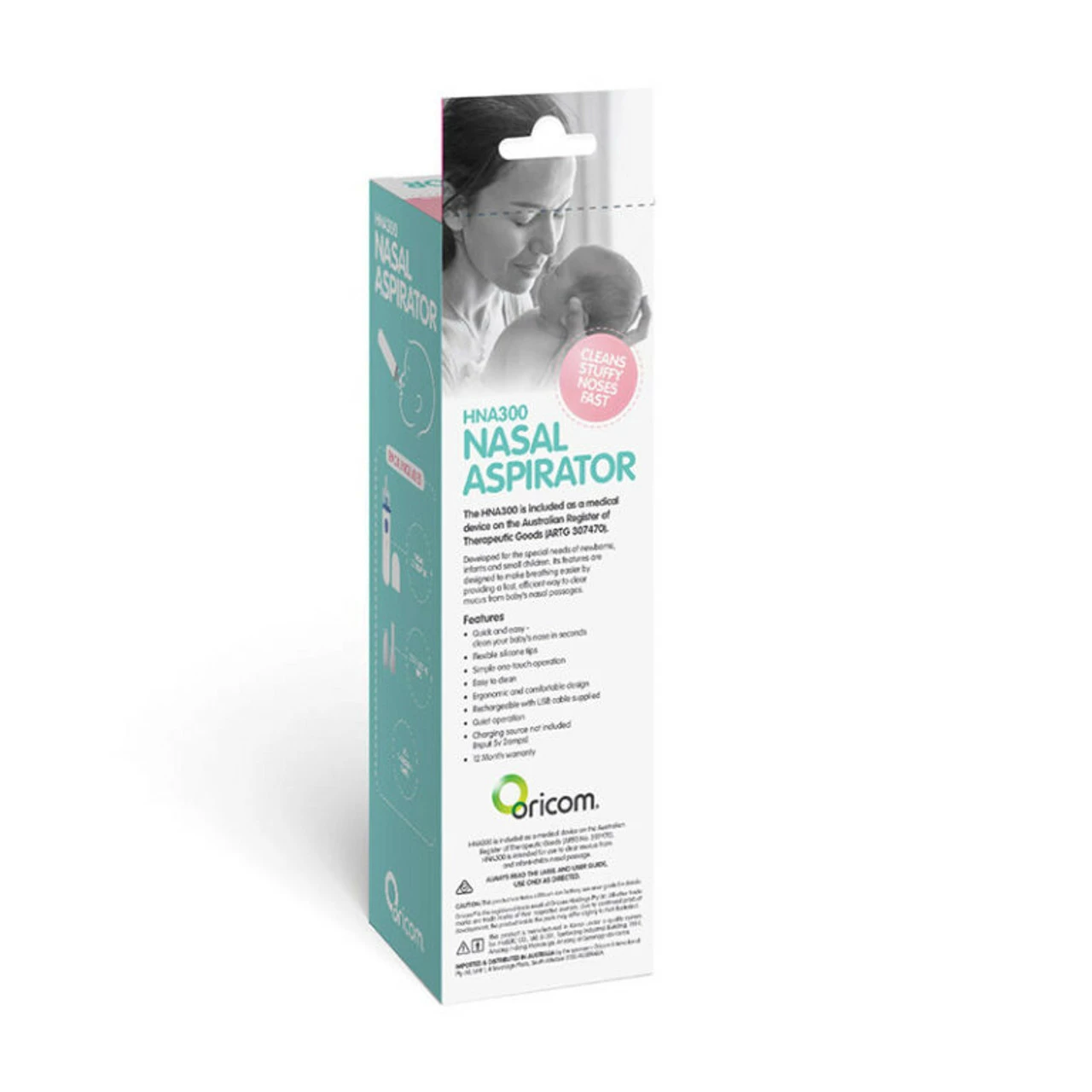 Developed for the nasal passage needs of newborns, infants and small children. Its features are designed to make breathing easier by providing a fast, efficient way to clear the mucus from a babys nasal passages. The HNA300 is included as a medical device on the Australian Register of Therapeutic Goods (ARTG 307470). Quick and easy – clean your baby’s nose in seconds. Flexible silicone tips. Simple one-touch operation. Easy to clean. Ergonomic and comfortable design. Rechargeable with USB cable supplied. Quiet operation. Charging source not included (Input 5v 2amps). 12 Month warranty.