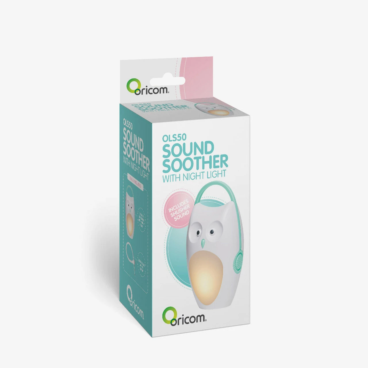 Introducing the Oricom OLS50 Portable Sound Soother with Night Light. This cute owl shaped night light includes soothing nature sounds, lullabies and white noise to assist with the sleep routine of your child. Portable and battery powered, this device can travel with you as required, and is a beautiful addition to any nursery.