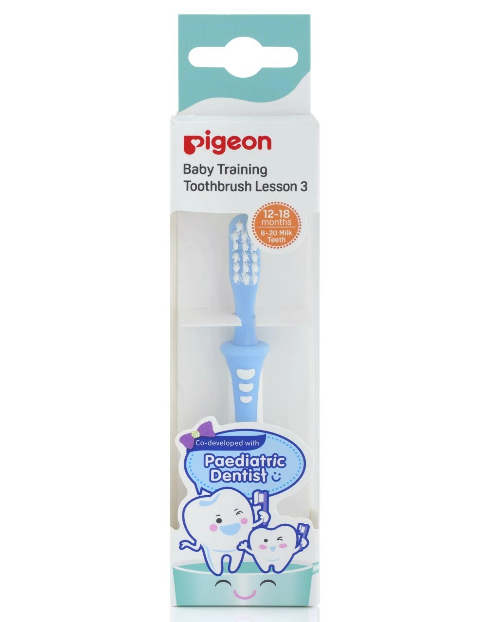 Pigeon Training Toothbrush Step 3 is a toothbrush for when most of the milk teeth are in and your infant is ready to try their first real toothbrush with toothpaste. The rounded bristle ends are soft and gentle on the gums.