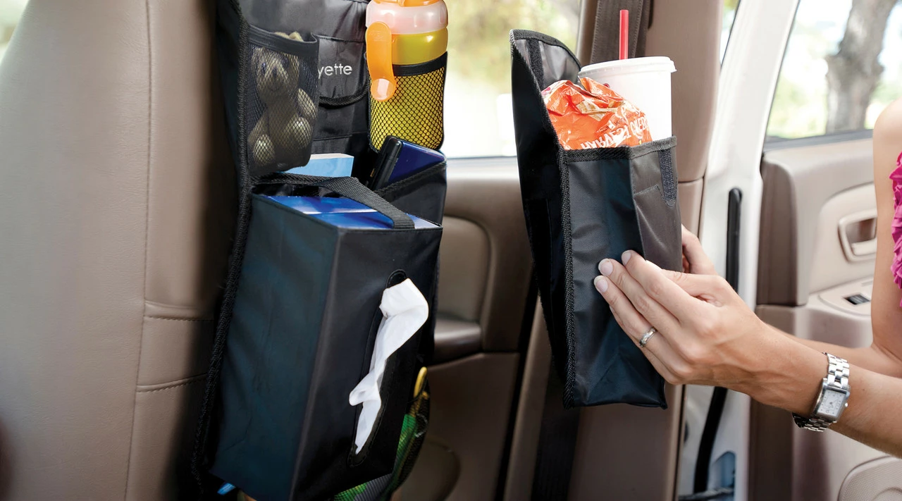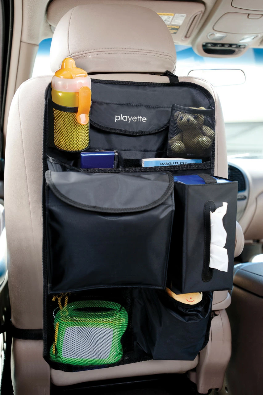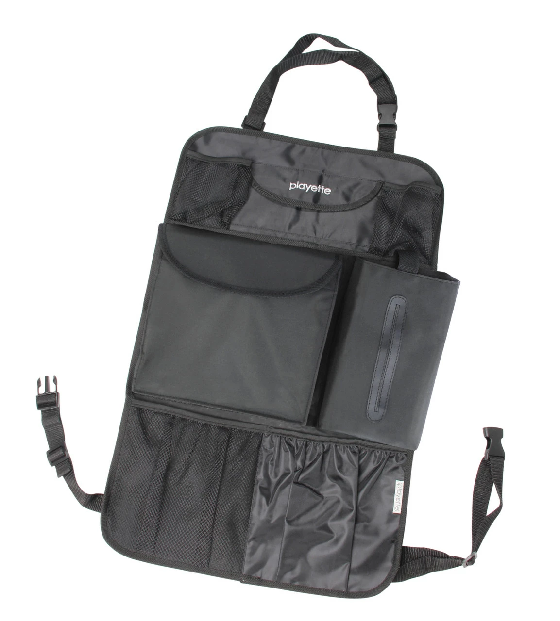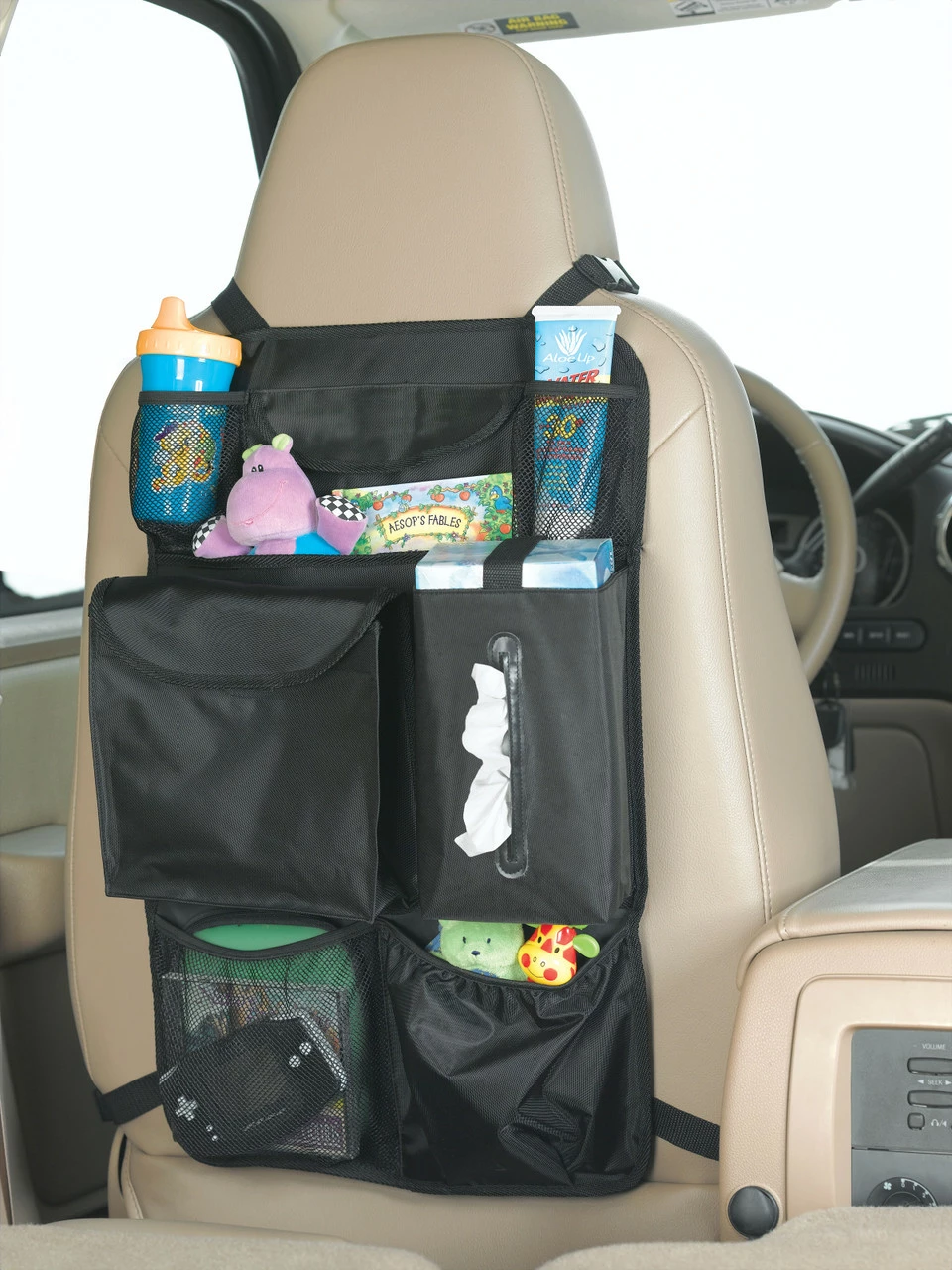 Convenient storage solution for your travel needs, buckles easily to back of seat, wipes clean easily, removable waste compartment, tissue dispenser, heavy duty non-rip nylon material and attaches easily to back of seat