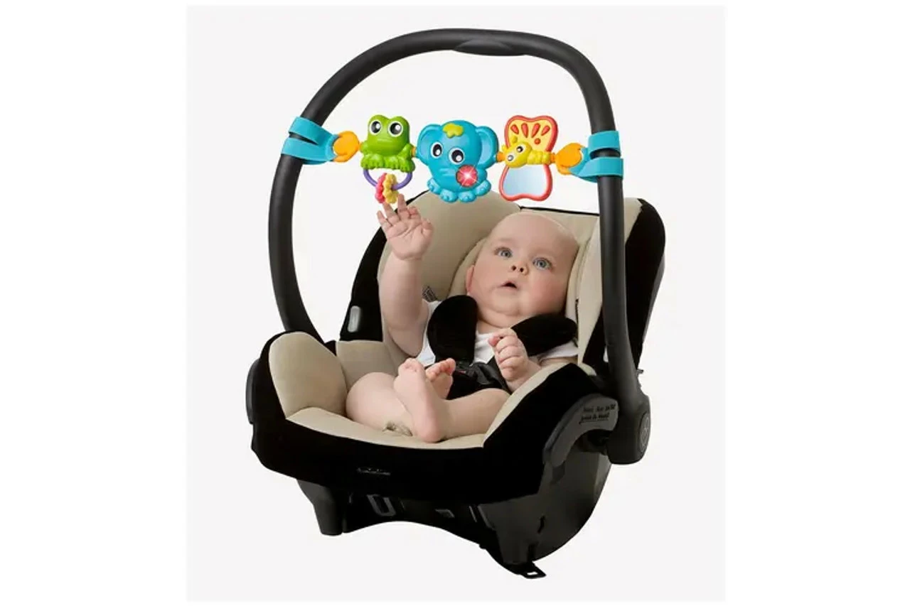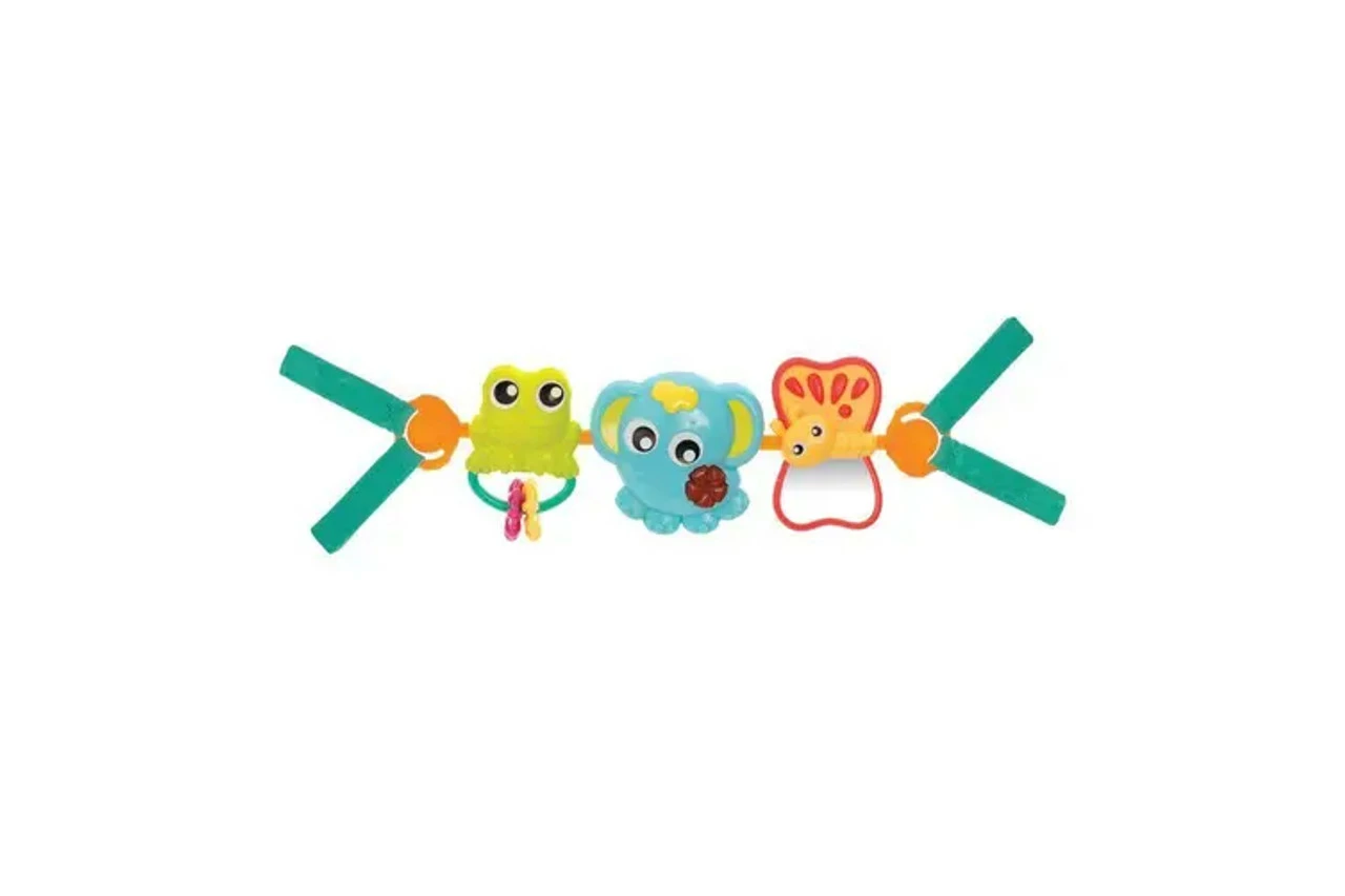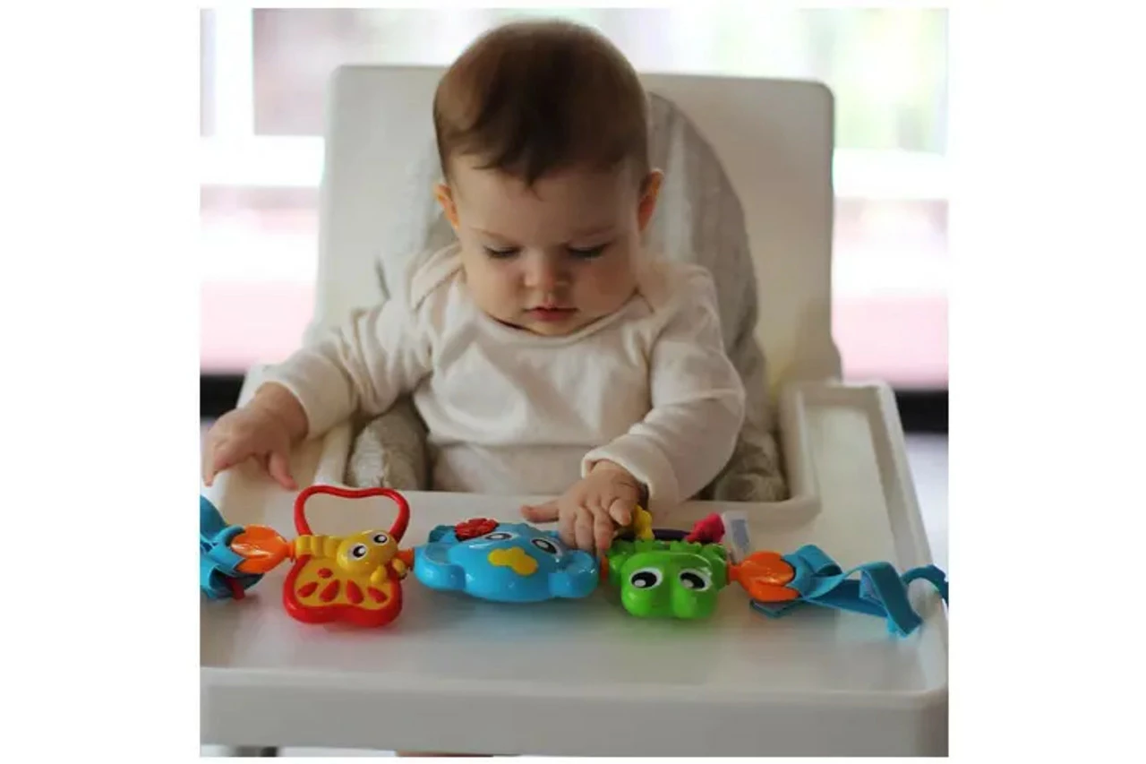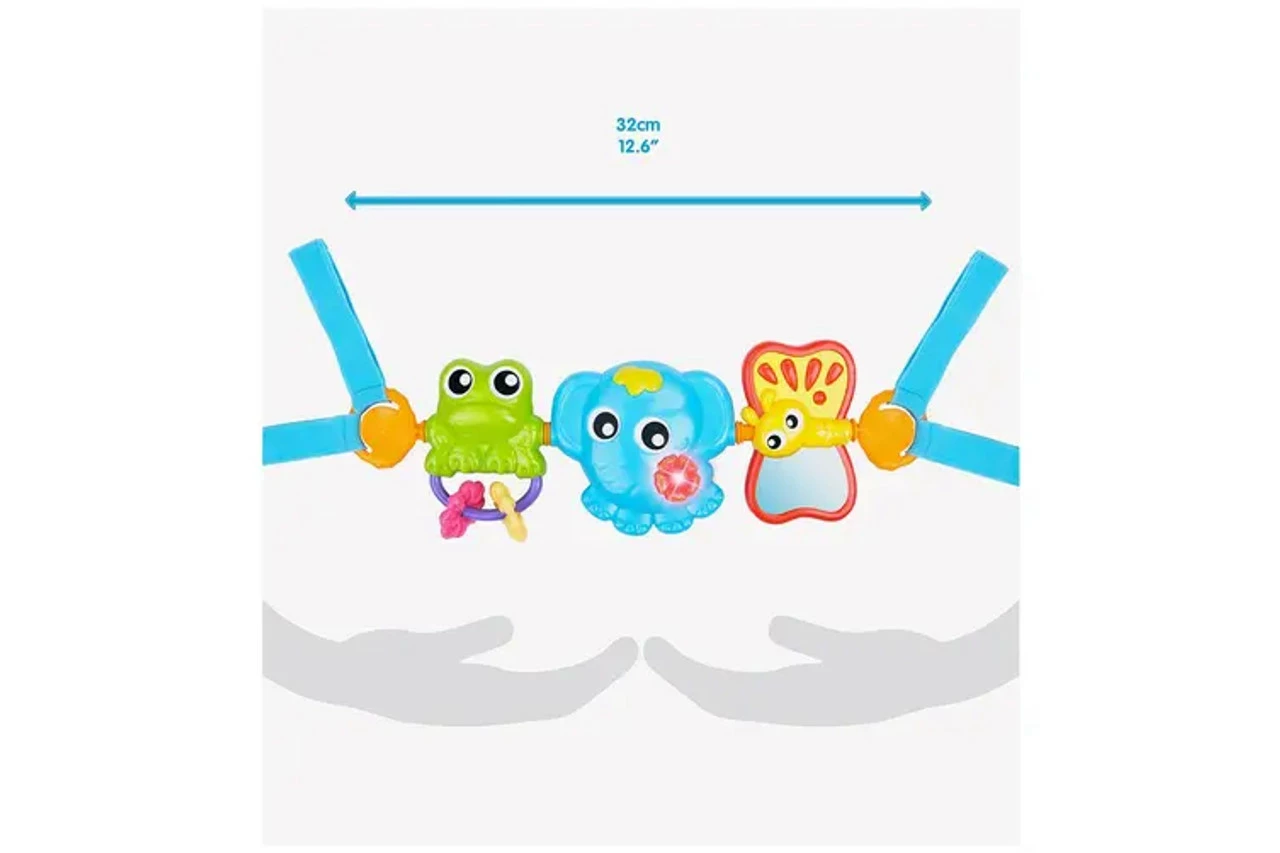 The Playgro Travel Trio Musical Pram Tie Baby Activity Toy lets your child enjoy stimulating educational playtime even while on the go with its bright colours, dancing lights, and spinning toys.