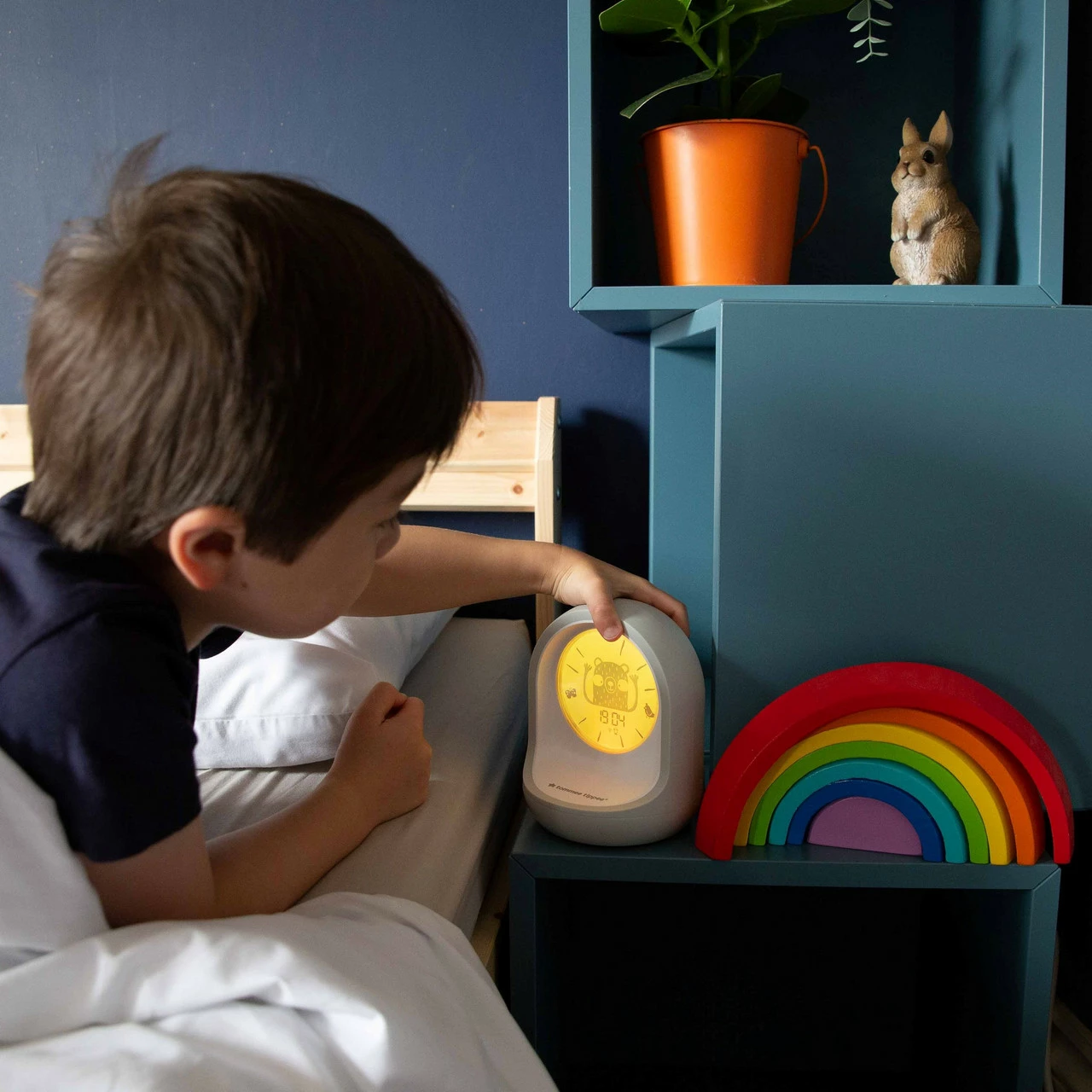 Our new sleep trainer helps your child to learn when it’s time to go to sleep and when it’s OK to wake up and play. The clock displays the time in digital format but also shows the passing of time using colours and symbols which your child will love. Even when they can’t yet tell the time they will soon learn when they need to close their eyes and go back to sleep and when it’s okay for them to spring out of bed, ready to play. This sleep aid clock is so easy to set up and use and now you can control everything using our Tommee Tippee app on your smartphone. Just download the App from Google Play or Apple App store and off you go. Set alarms, play lullabies, customise the colours and select the desired level of brightness for your child’s room, all from your phone. Parents are able to set multiple alarms to show your child when it’s wake-up time, naptime, toilet-time and when you want them to stay in bed just that little bit longer for a much-needed lie in. The 10 soothing sounds which include well-known lullabies and white noise are played through the high-quality speaker to help settle your child back to sleep. As your child grows the sleep trainer can also be used as a handy nightlight for comfort and reassurance or for when your toddler needs a night-time toilet trip. The Sleep Trainer Clock uses a micro-USB charger* so there’s no need for batteries (*excludes adaptor plug but compatible with most USB plugs used as phone chargers) At Tommee Tippee, we design products that make life simpler for busy families. We’ve been doing this for over fifty years, and millions of babies have grown up with our bottles, soothers, cups, and care range. With our fast-growing Sleep range, we’re helping families with the biggest challenge of early parenthood: getting a good night’s sleep! Our collection of sleepwear and sleep aids such as our Groclock, Groegg and lovable Grofriends provide complete peace of mind for parents – so you can all get some well-earned rest! App-enabled sleep trainer: The Tommee Tippee Timekeeper Sleep Trainer Clock teaches your child when it’s time to sleep and when it’s time to get out of bed Customisable from your phone: Download the free App to control the display, music, colours, brightness and alarm settings from your phone 10 soothing sounds: Choose from 5 beautiful lullabies and 5 natural sounds to help settle your child to sleep Child lock and power cut recovery mode: The child lock stops little fingers from changing the settings and the clock won’t lose its settings if there is a power cut Batteries not required: The Sleep Trainer Clock uses a micro-USB charger* so there’s no need for batteries (*excludes adaptor plug but compatible with most USB plugs used as phone chargers)